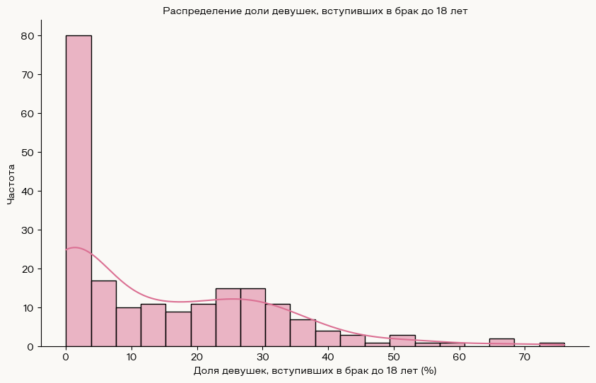 Визуализация наглядно демонстрирует, где проблема ранних браков является наиболее значимой. Распределение помогает выделить страны с наибольшей критичностью этой социальной проблемы и понять, какие значения встречаются в датасете наиболее часто.