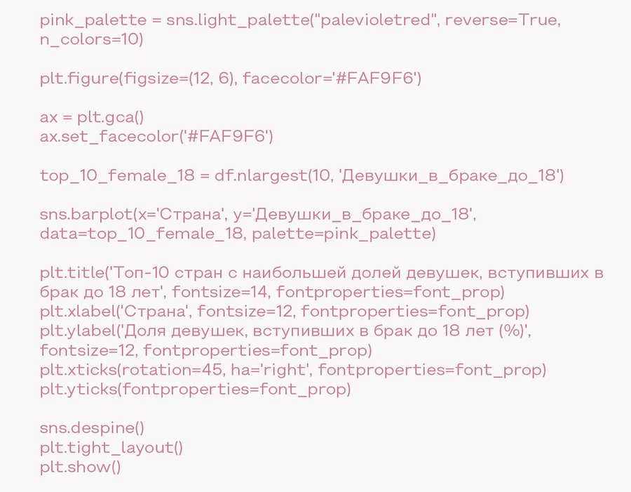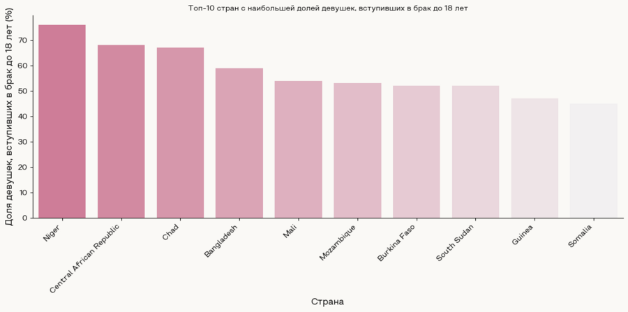 Для этого были взяты данные из столбца «Девушки в браке до 18» и отсортированы по странам, где их количество наибольшее. Для столбчатой диаграммы были взяты первые 10 результатов.