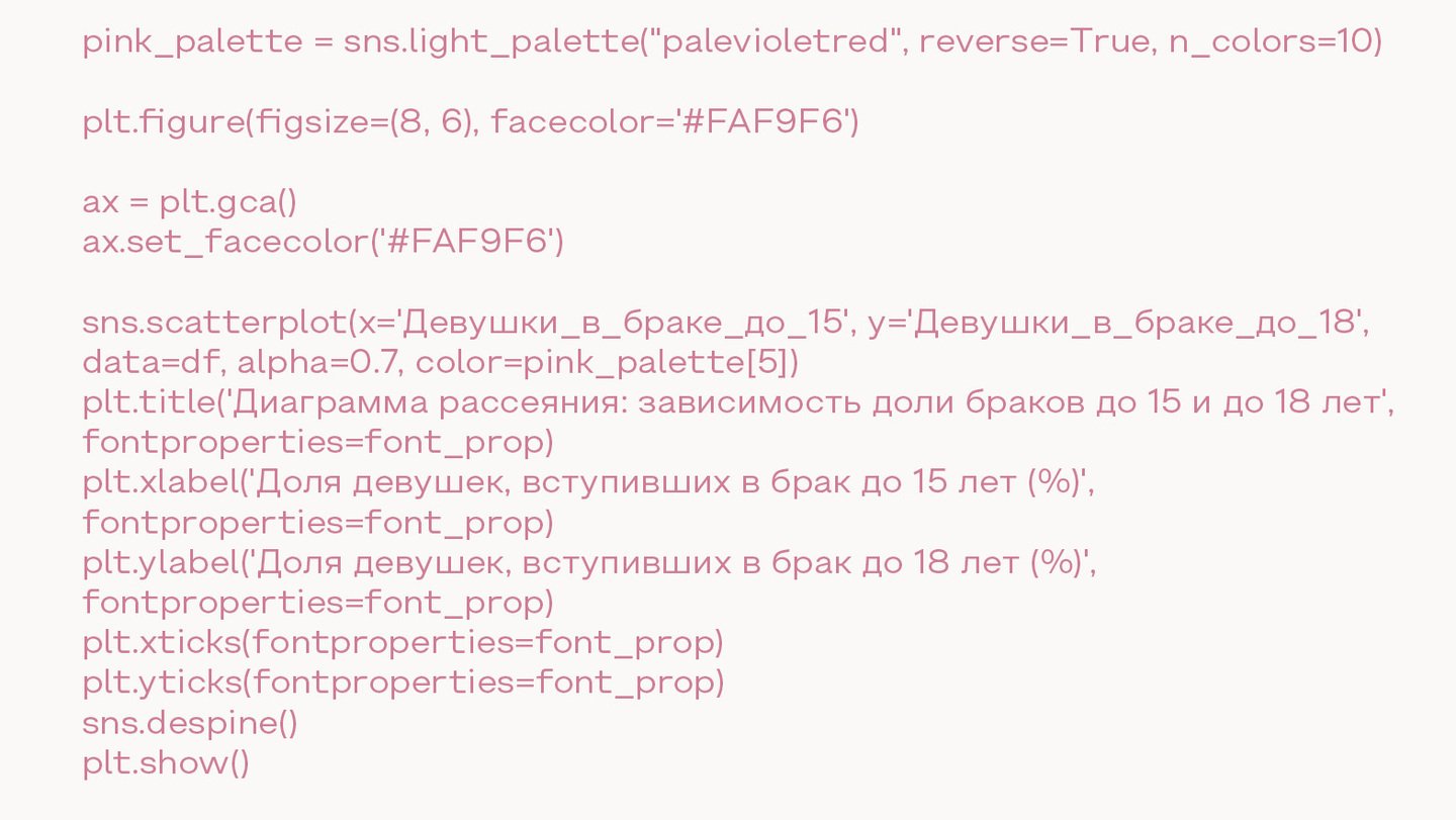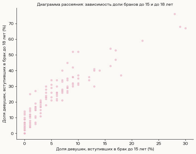 Диаграмма рассеяния демонстрирует взаимосвязь между долей девушек, вступивших в брак до 15 лет, и долей тех, кто вступил в брак до 18 лет. График показывает, что существует положительная корреляция между этими двумя показателями: чем больше доля браков до 15 лет, тем выше доля браков до 18 лет. Распределение точек подтверждает наличие устойчивой тенденции.