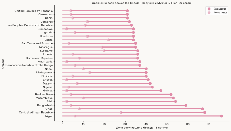Диаграмма отображает сравнение доли ранних браков (до 18 лет) среди девушек и мужчин в разных странах. Ось Y представляет список стран, а ось X показывает процент вступивших в брак до 18 лет для каждой группы. График позволяет визуально оценить различия в распространенности ранних браков между полами в одних и тех же странах. Для большинства стран заметно, что доля девушек, вступивших в ранний брак, значительно выше, чем среди мужчин.