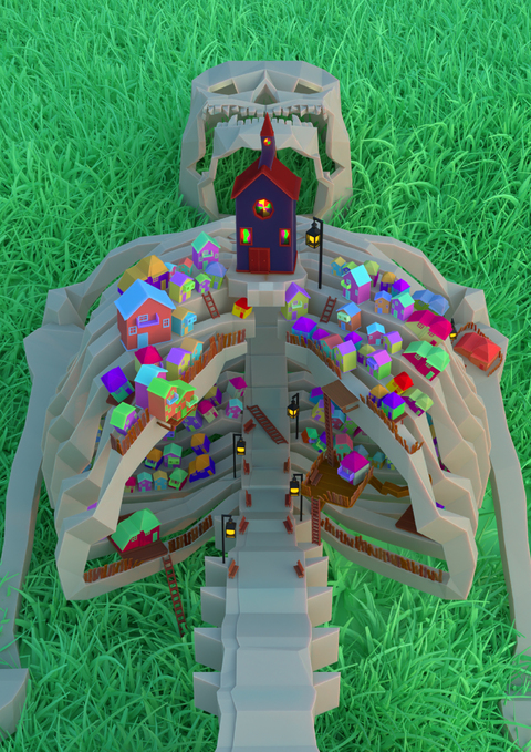 A paper city standing on a huge skeleton buried deep into the ground. Small houses sit on the bones, most of them crammed onto the ribs. Ladders, bridges, and fences braid the giant skeleton. Grass makes its way out from under the bones.