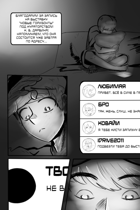 (не) выходи — это комикс в жанре социального хоррора о молодом и неуверенном в себе художнике, которого начинает преследовать сталкерша, вступившая с ним в парасоциальные отношения