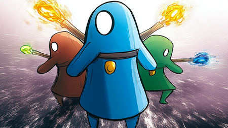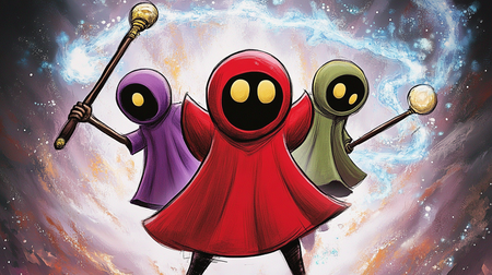 Промпт финальной обложки draw a dramatic game art poster. four wizards with different colored robes are standing in a square pressed into each other. elemental magic is swirling around them. epic art, cover art, dramatic