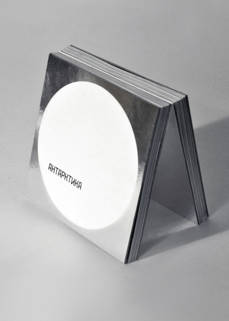 Размер одного книжного блока: 200×200 мм Формат обусловлен формой круга, который вписывается в квадрат блока и создает ассоциацию с ледяным пространством полюсов, особенно это прочитывается на обложке издания. Конструкция позволяет удобно сравнить историю исследований двух территорий. Цвет открытого корешка корреспондирует с цветами блока.