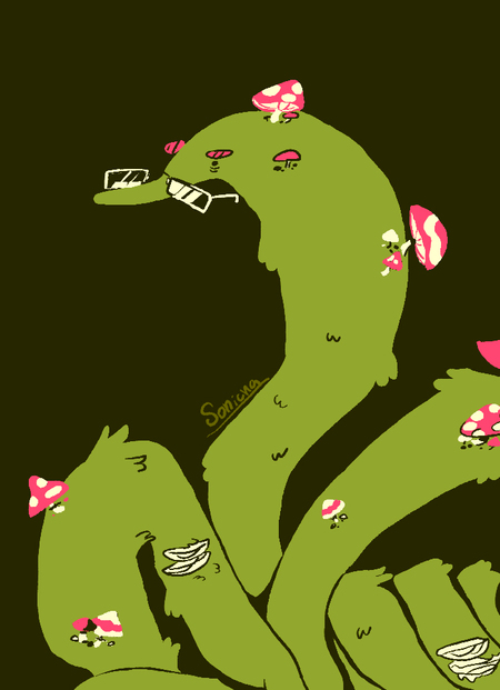 Лесной дикий цербер из пушистых игрушечных червяков. Он часто спит в теплый листьях и еловые иголках, из-за этого на нем растут грибы.