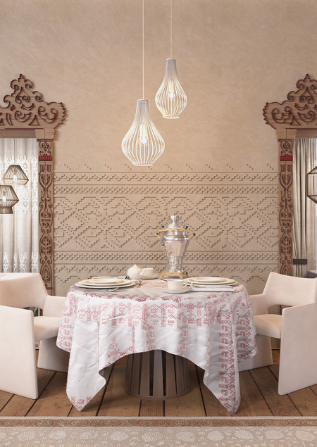 Светлое и яркое помещение гармонично сочетает в себе народные русские мотивы с современной мебелью, что придает пространству колорит и нарядность.