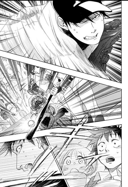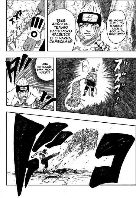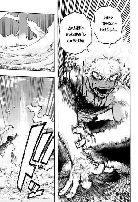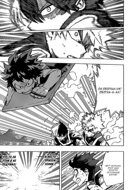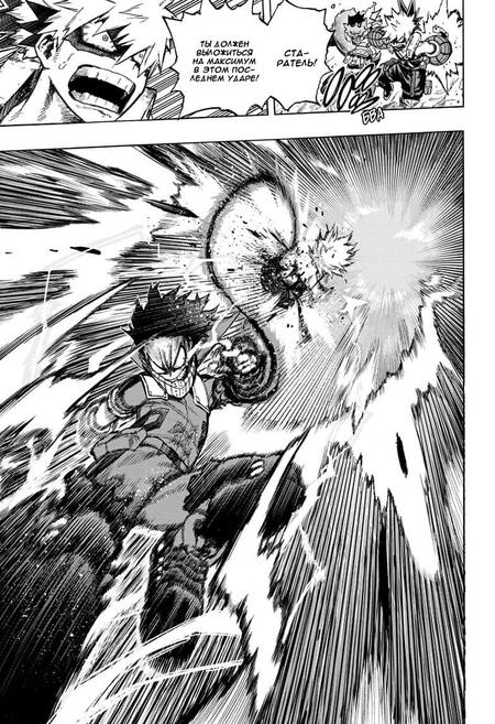 На данной странице манги «Моя геройская академия» представлено подобие сосредотачивающего кадра. В центре находится текст, несколько кадров, которые направлены в одну точку.