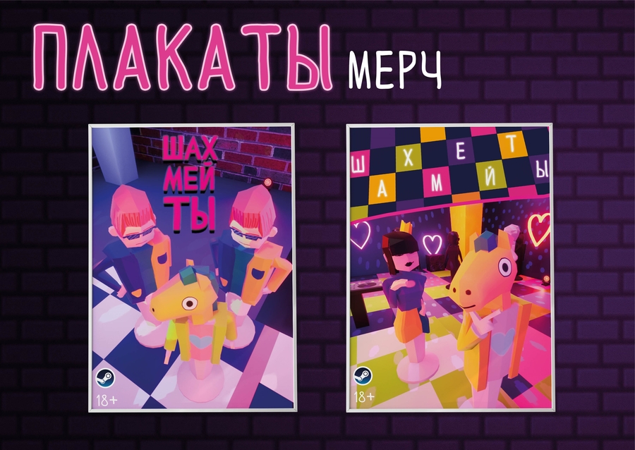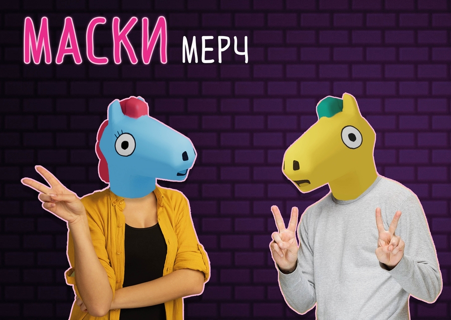 Промпт для первого плаката: generate a poster with two characters. The first character is a girl in a yellow T-shirt and a purple skirt, on her head is a mask of a cartoon horse with big eyes, pink skin and a blue mane. The second character is a guy in a pink T-shirt and light green jacket, on his head is a mask of a cartoon horse with big eyes, yellow skin and a green mane. They stand in a nightclub on the dance floor in the form of a chessboard.
