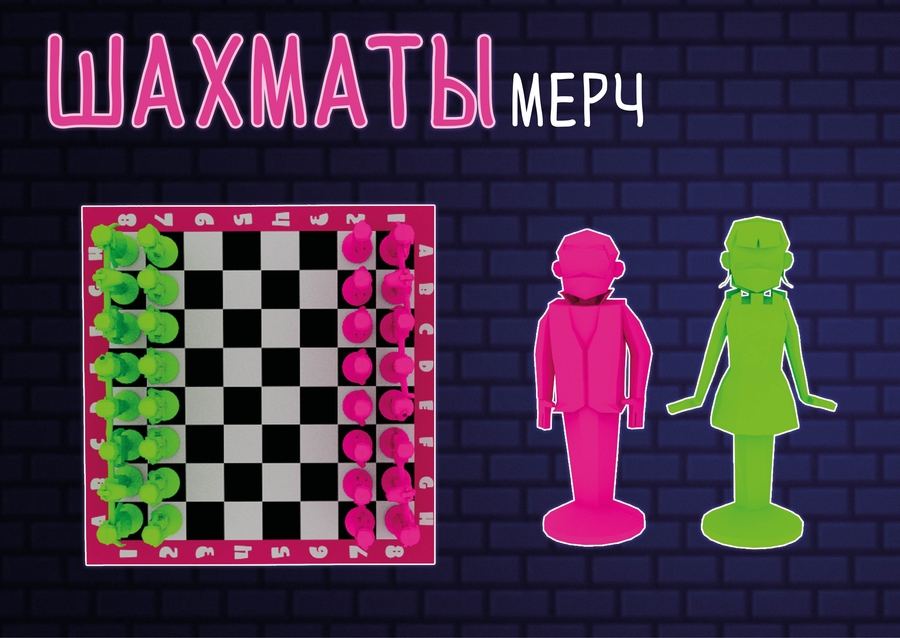 В оригинальном проекте при создании мерча я делала акцент на том, что персонажи — шахматные фигуры, а главные герои — кони.