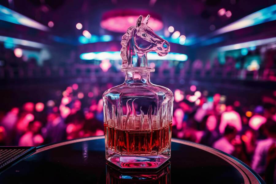 Промпт для графина: transparent decanter with a lid in the shape of a horse’s head on the bar table in night club