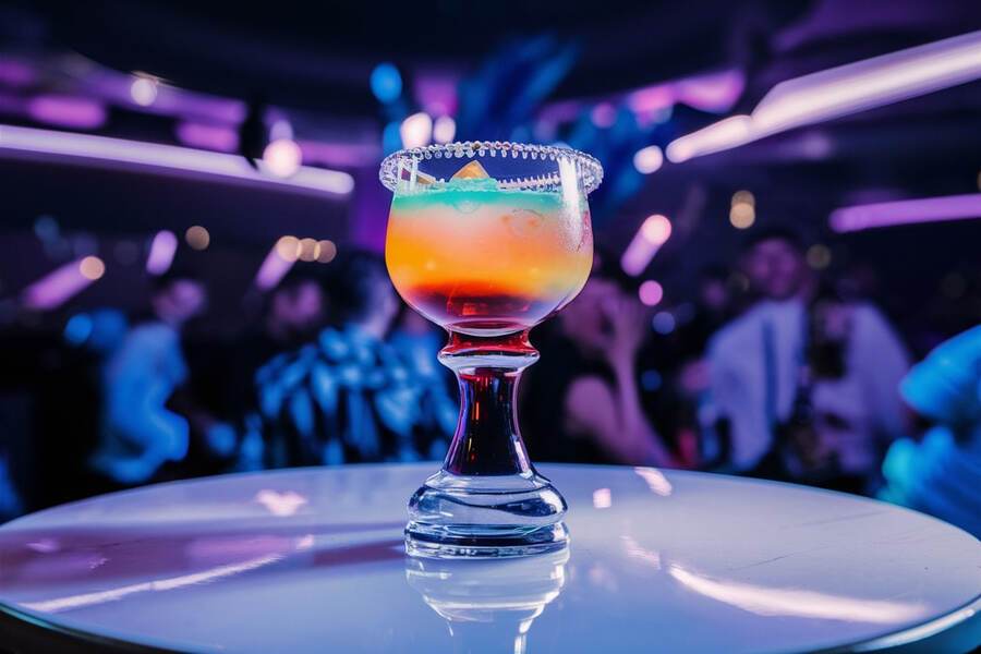 Промпт для бокала: glass with a stem in the shape of a pawn on the table in night club. without letters on glass.