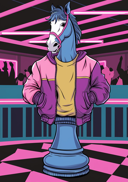 Для второго плаката я решила использовать картинку, которую мне выдала нейросеть, когда я генерировала обложку. Промпт для обложки: generate a character whose upper part is human and whose lower part is like a chess piece. the character is wearing a pink and purple jacket and a yellow T-shirt, and has a blue and pink horse mask on his head. he is standing in a nightclub with pink neon lighting