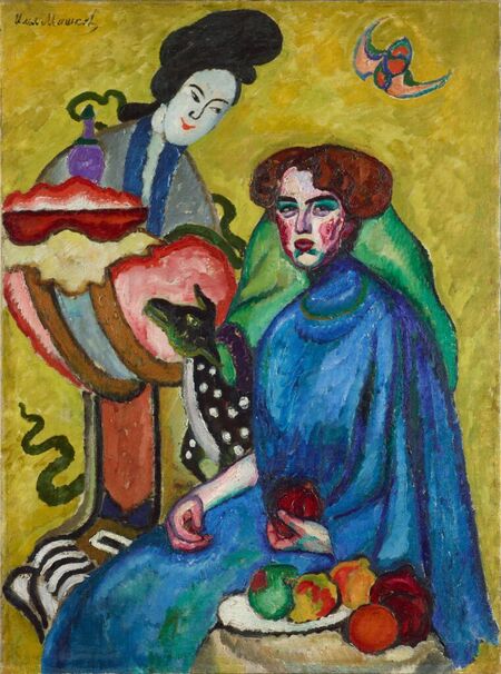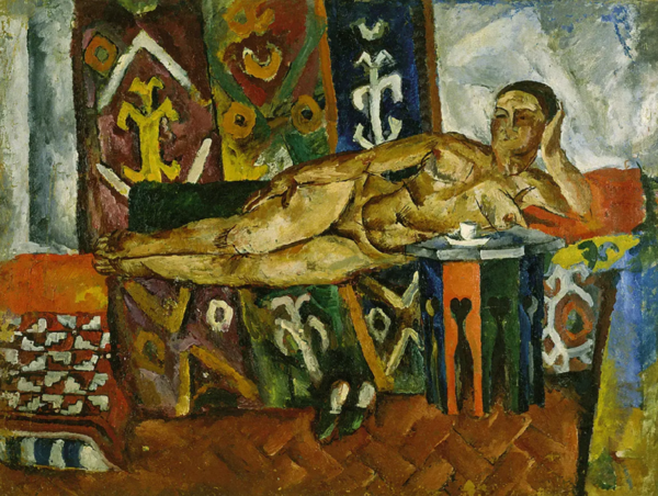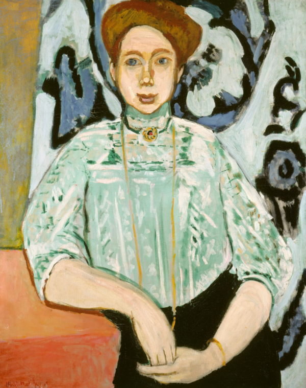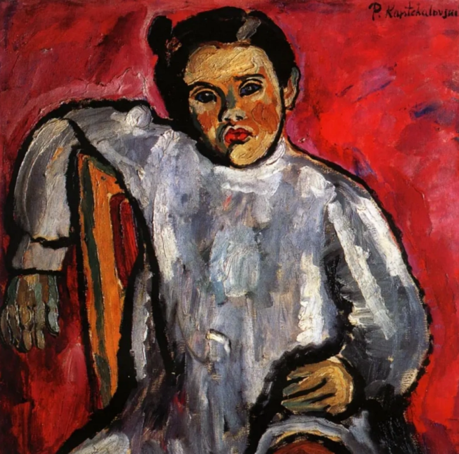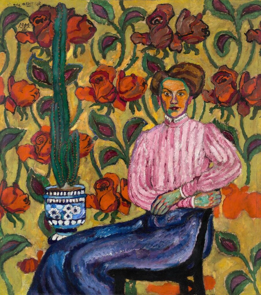 В картине «Женский портрет (на фоне обоев)» 1908 года постановка фигуры как у Сезанна. Фигура и задний план получаются связанными, неразделимыми между собой за счёт декоративного задника, как в картинах Матисса (натюрмортах), Сезанна и Ван Гога (портретах), цвета и мазков.