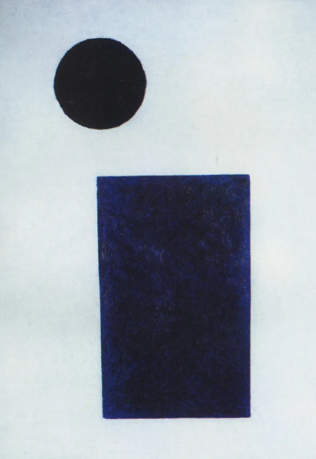 Первая работа содержит в себе основание двух первичных геометрических элементов супрематизма. Однако их соотношение пропорций не сходится. Мы можем видеть, что синий прямоугольник доминирует в пространстве над чёрным кругом, но не соприкасается с ним. В следствие чего белое пространство становится мостом, который будто отделяет фигуры, не давая им встретиться.