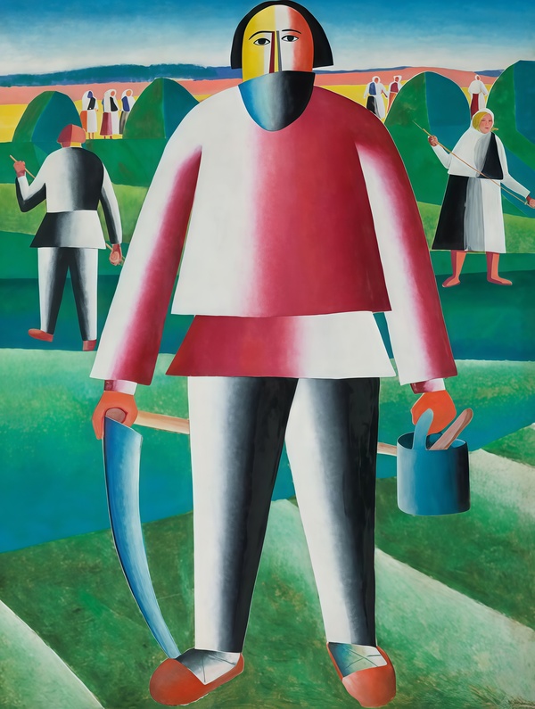 Однако новая работа претерпела изменения в фоне. Малевич решил не ограничиваться однообразным декоративным задним планом, поэтому в работе 1929-го года он прибегает к пейзажу, добавив на фон других работников. Зелёный цвет придаёт картине необычный визуальный эффект, заставляя зрителя воспринимать работу автора иначе.