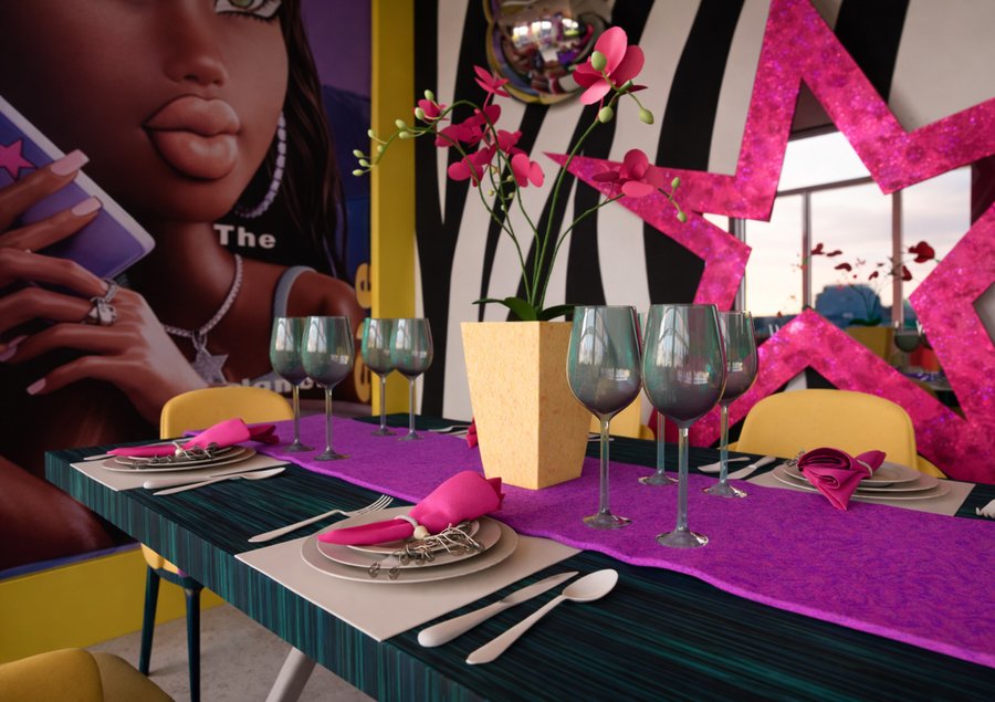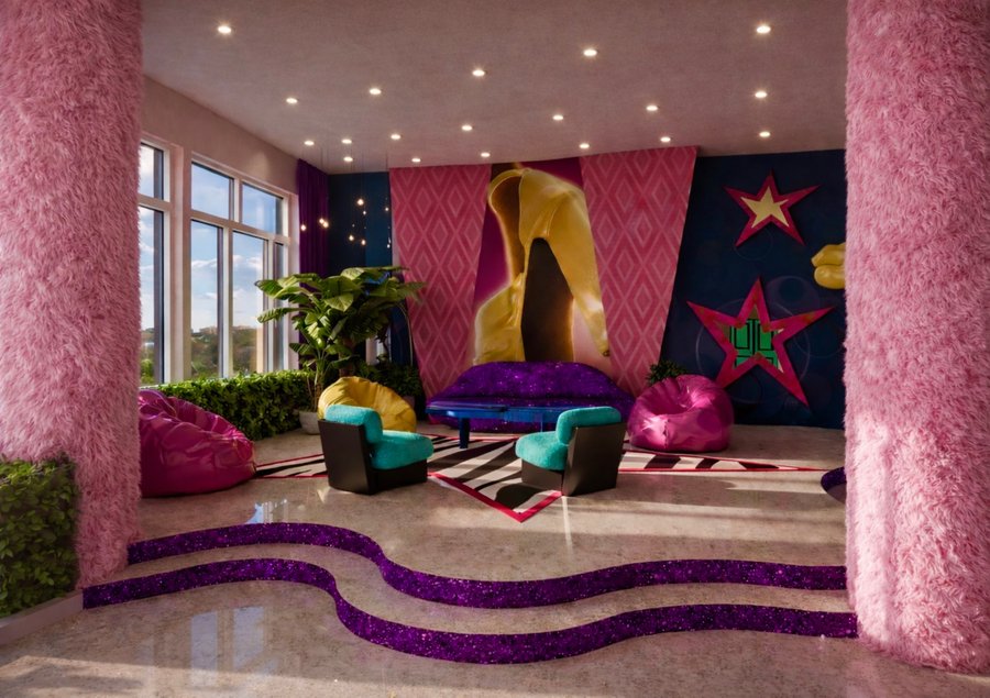 1. Зона входа / «Глэм-прихожая»: · Задача: Сразу погрузить гостя в дерзкий, гламурный мир Bratz. Создать эффект «вау» и инстаграмный момент. · Детали: Знаковый диван в форме губ, зебровый ковер, трапециевидные формы стен (отсылка к коробке), стойка ресепшена в пушистой текстуре со звездами. Цветовая палитра задается сразу: кислотно-розовый, фиолетовый, бирюзовый с металлическим блеском.