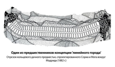 Артуро Сории-и-Маты предложил развивать город вдоль железной дороги, отвечая на рост населения, индустриализацию и потребность в связной транспортной системе.