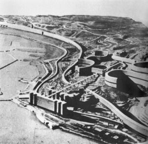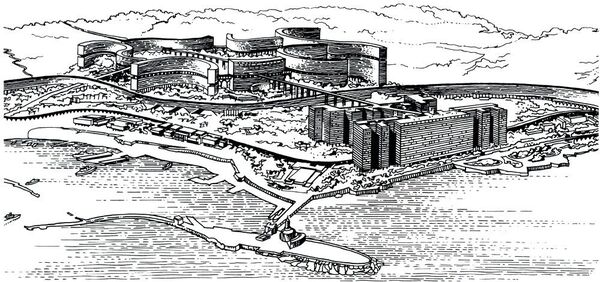 «Ле Корбюзье. Проект ленточной урбанизации Алжира (1929–1930 гг.). Общий вид города со стороны Средиземного моря. Вдоль побережья тянется гигантское здание, на крыше которого проходит автострада».