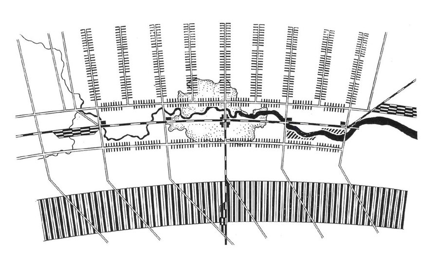 При линейной планировке городские объекты выстраиваются вдоль единой линии, часто использующей природные или инфраструктурные коридоры, такие как реки или транспортные артерии.