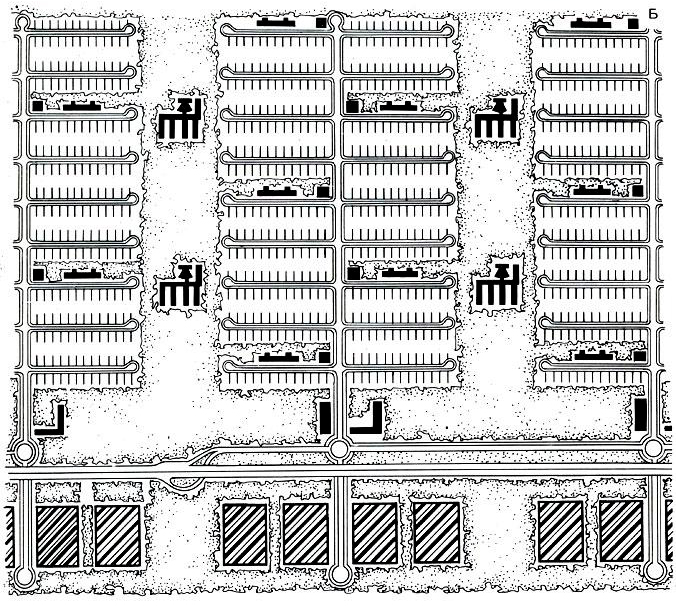 2. «Фрагмент линейного города Людвига Гильберсаймера, сочетающего большую индустриальную магистраль с тупиковыми ответвлениями жилых улиц, по сторонам которых располагается малоэтажная жилая застройка и школы».