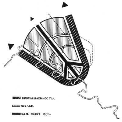 «схема H. А. Милютина с параллельным расположением промышленных и жилых районов».