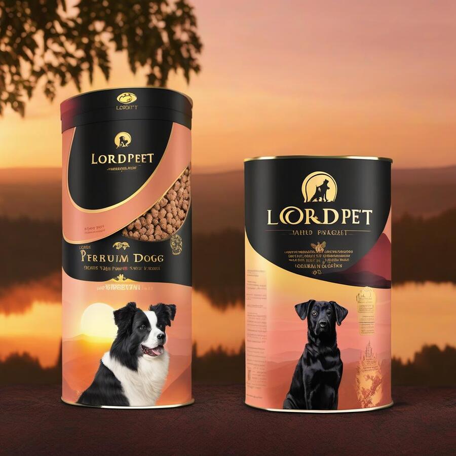 Photo of realistic packaging of premium segment dog food «LordPet» in black, gold, burgundy shades, against the background of a soft peach sunset in a natural environment