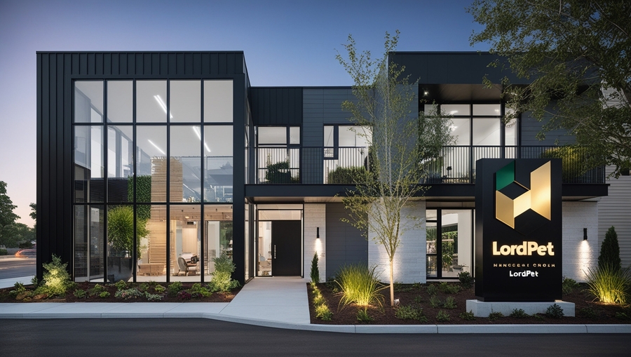 Logo and brand colors: A sign with a clear, memorable LordPet logo, made in the brand’s corporate colors (black, dark green, gold) — immediately attracts attention. Landscaping: Live plants — ornamental shrubs, flowers — along the facade, on the balconies, create a pleasant impression and emphasize the connection with nature. Lighting: Thoughtful evening lighting — illumination of the facade, landscaping, signboard — attracts attention in the dark--ar 16:9