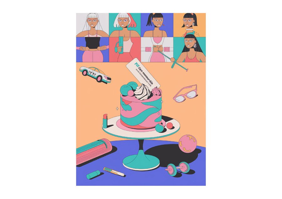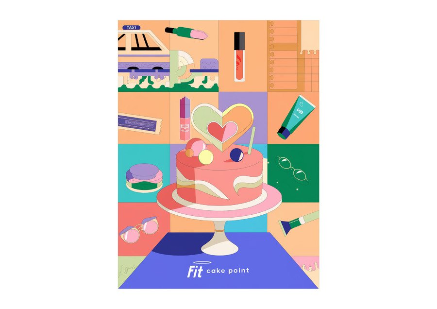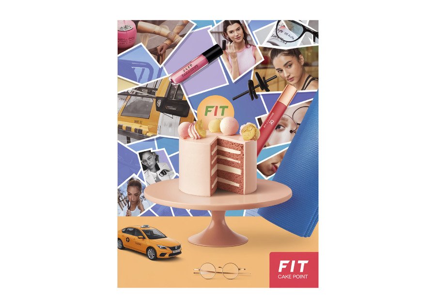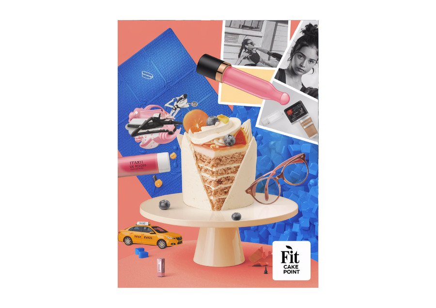 /imagine prompt: A creative advertising poster for FIT CAKE POINT, featuring a modern dessert on a table, surrounded by objects: a taxi, a lip gloss, a training mat, and a floating glasses. The background is a collage of different samples of girls daily routine.