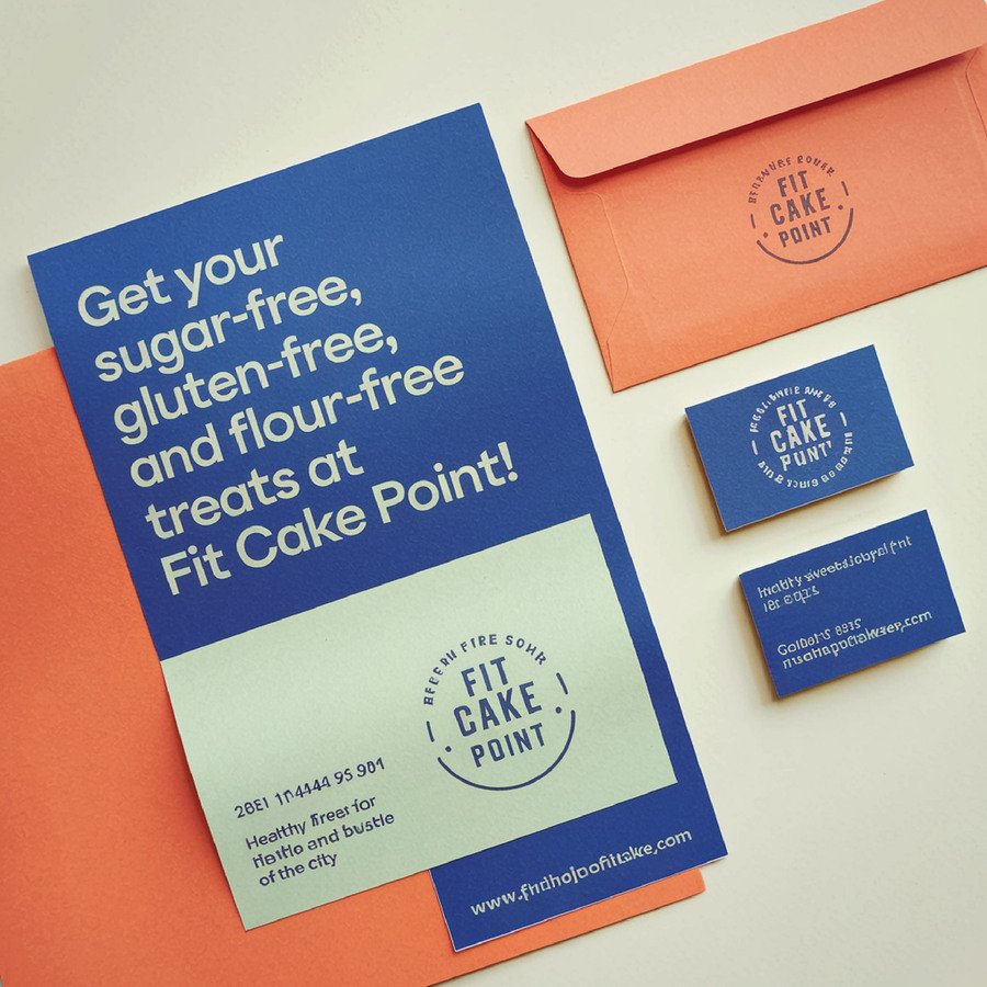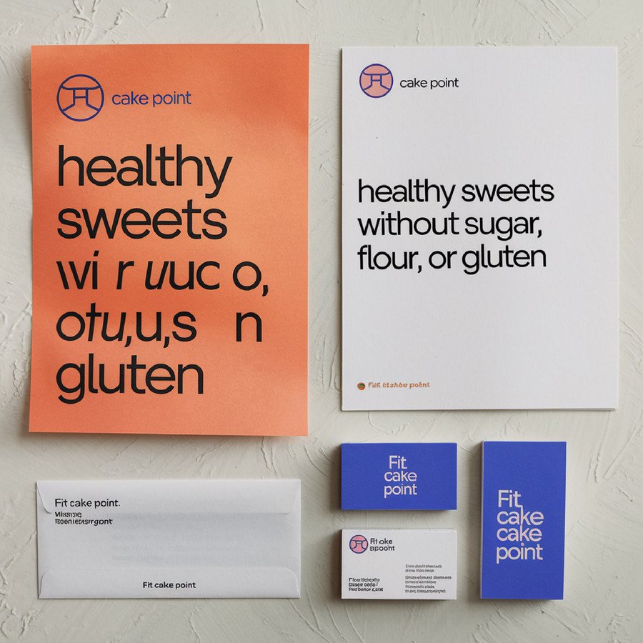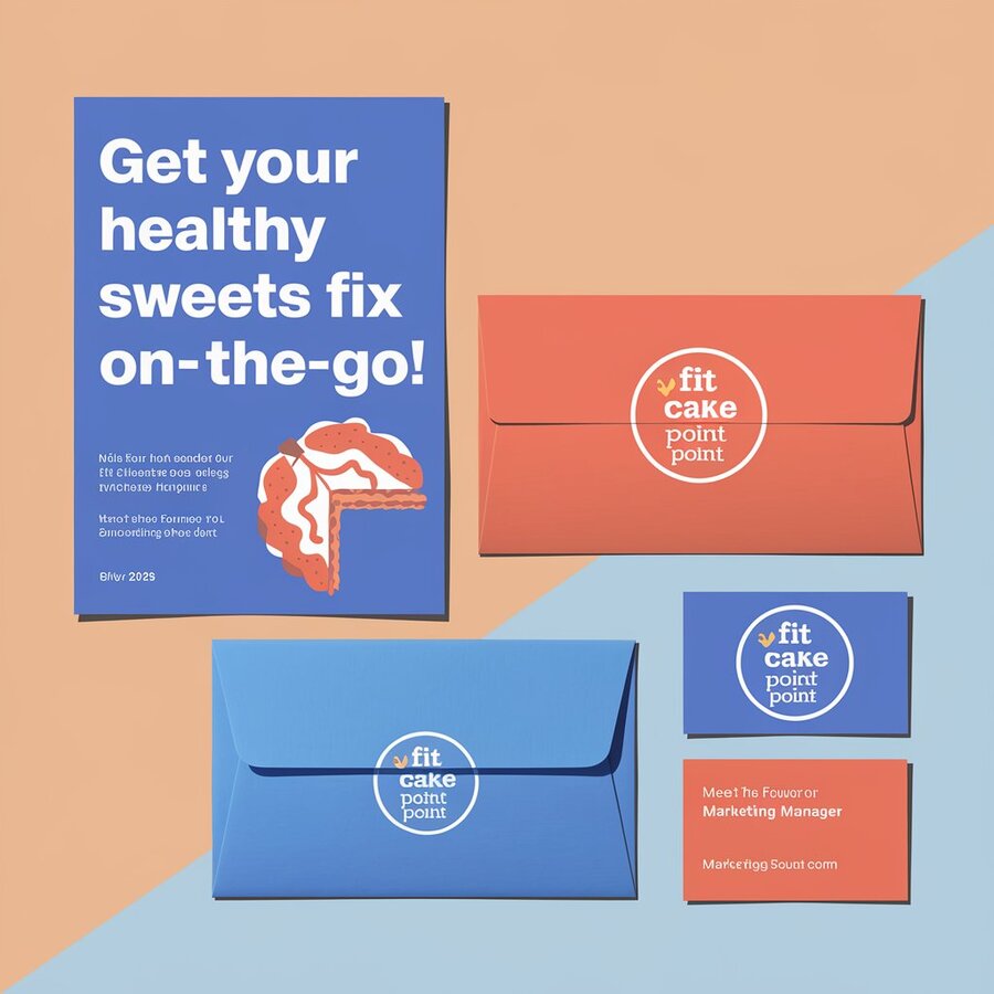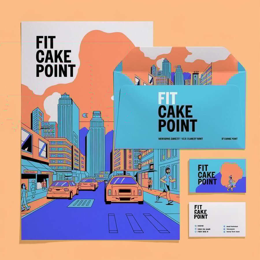 /imagine prompt: generate a mockup of printed materials (paper, envelope, business cards) on a white background for the FIT CAKE POINT. This is a brand of vending machines offering healthy sweets without sugar, flour, or gluten. Use the metaphor of movement, rush, and the hustle and bustle of a big city.