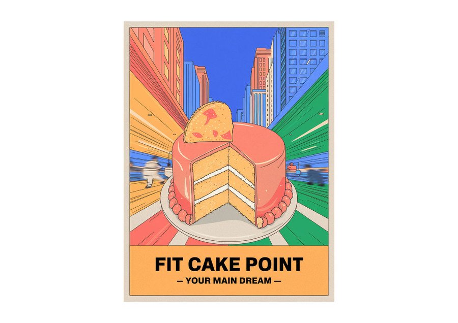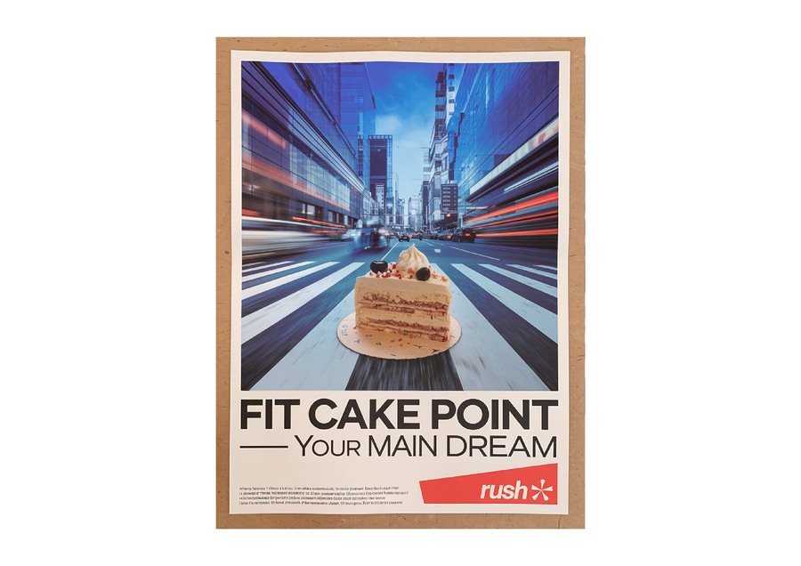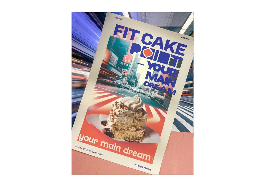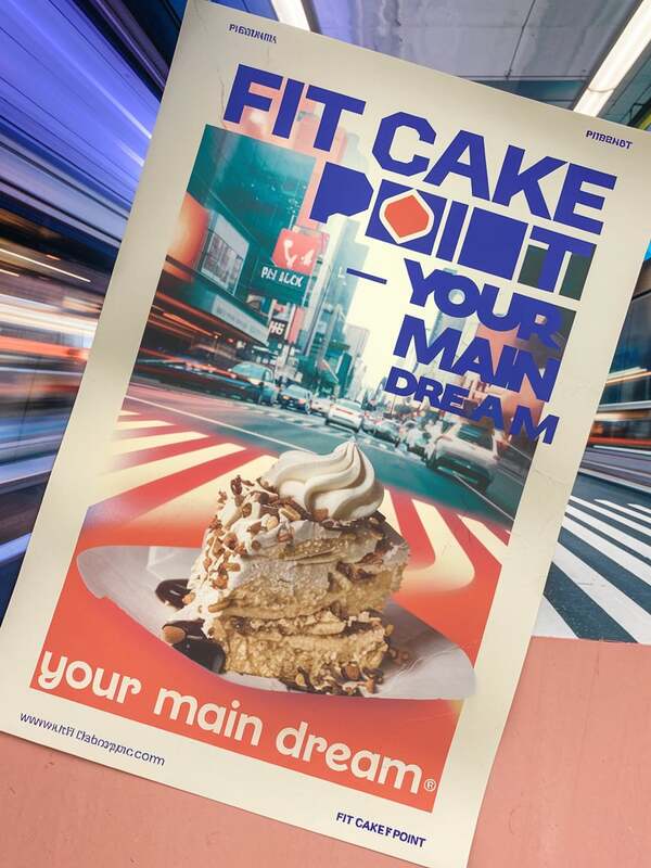 /imagine prompt: A movement and rush-inspired advertising poster for FIT CAKE POINT. The photo features a yummy dessert. The background is a hustle and bustle of a big city. The poster is printed on high-quality paper, with bold typography stating ’FIT CAKE POINT — your main dream’.