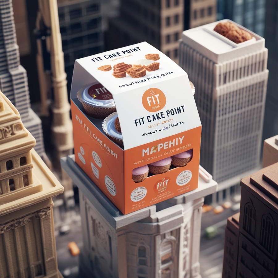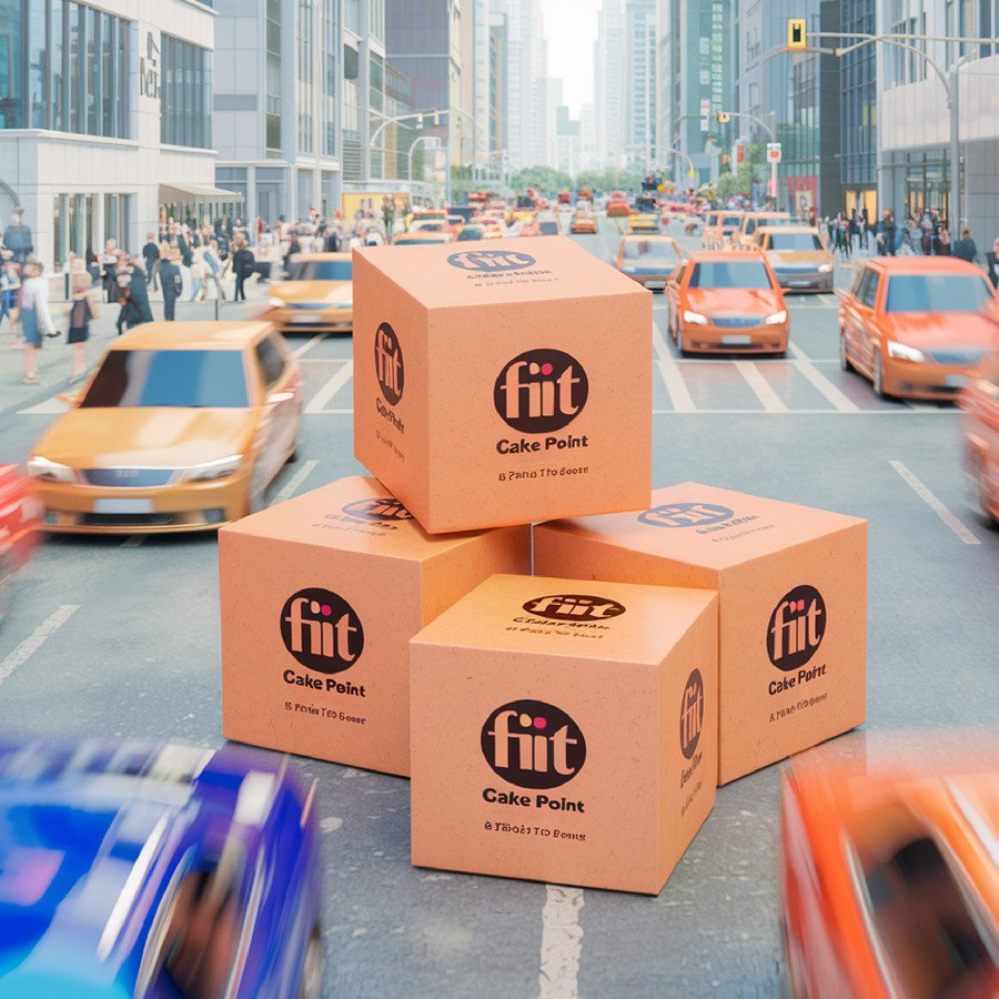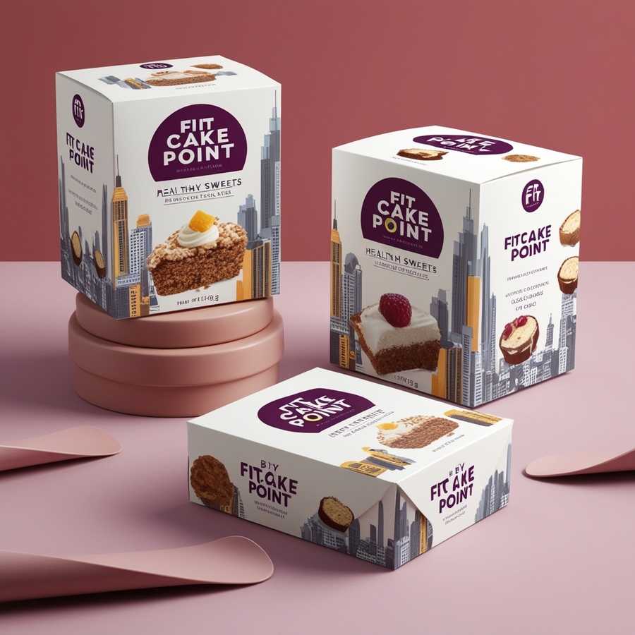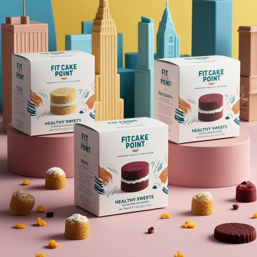 /imagine prompt: generate 3d render of packaging design for boxes with desserts by FIT CAKE POINT. they produce healthy sweets without sugar, flour, or gluten. Use the metaphor of movement, rush, and the hustle and bustle of a big city
