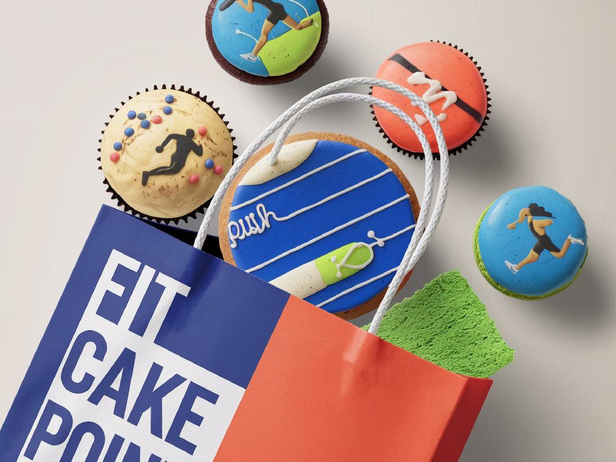 /imagine prompt: generate a mockup of stickers on a bright background for the rush and movement-inspired FIT CAKE POINT brand which sells healthy desserts