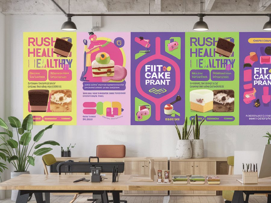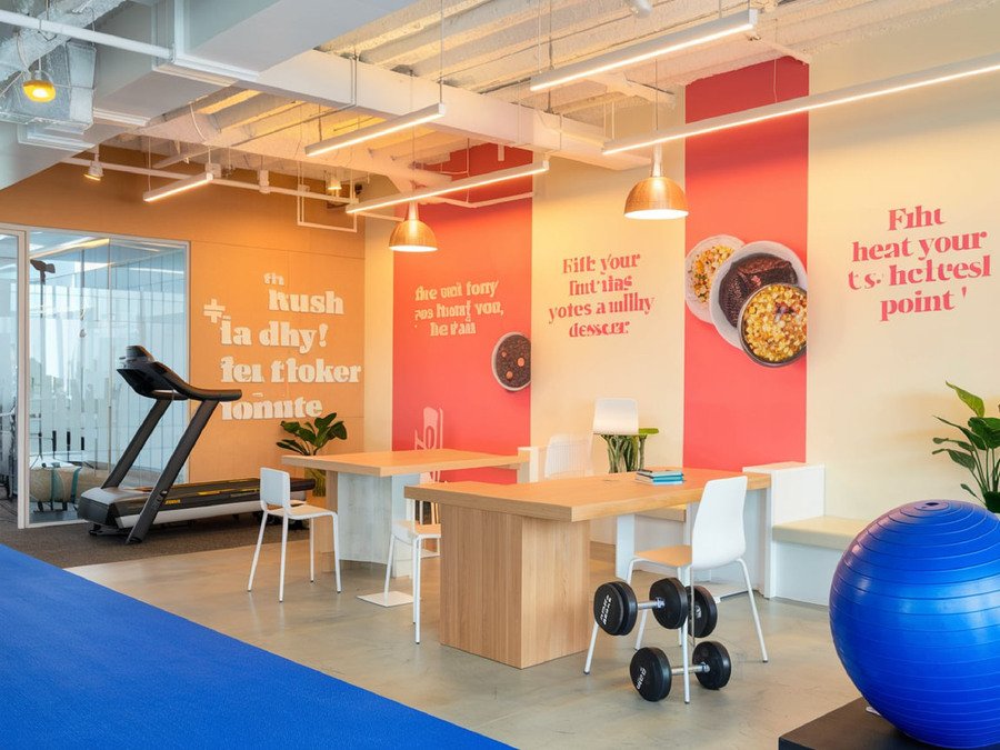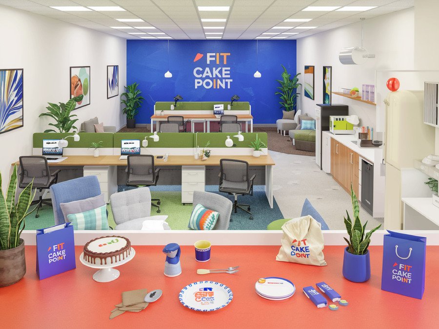 /imagine prompt: generate a mockup of interior of a bright office for the rush and movement-inspired FIT CAKE POINT brand which sells healthy desserts