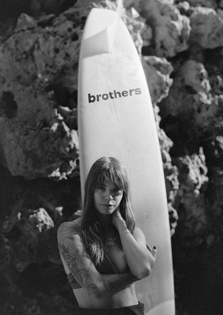 Промт для логотипа: «Design a logotype for a surf club named 'Brothers' located on the rugged coast of Kamchatka. Use a minimalist black and white color scheme with a focus on dynamic, wave-inspired forms and a subtle blurred effect to evoke motion and the raw energy of the sea. Incorporate elements that reflect camaraderie and adventure.» (логотип создавался на основе изображения)