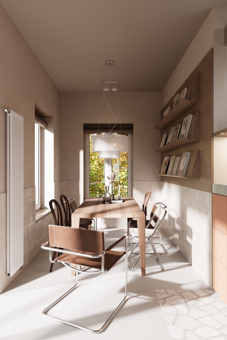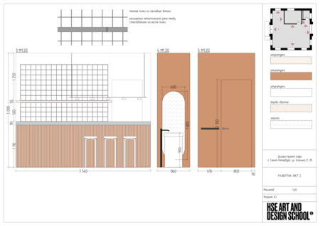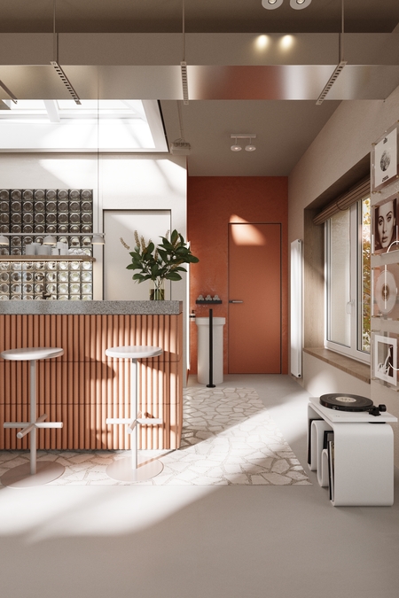 Функциональная в использовании, трансформирующаяся мебель. Использование текстур и материалов, отсылающих к интерьрам советской эпохи (дерево, стеклоблок, плитка различного формата).