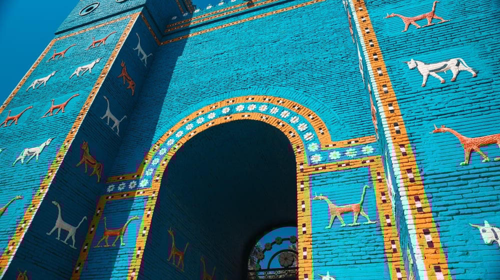 Вавилон производит совершенно иное впечатление. Если ассирийские дворцы были суровыми крепостями, то вавилонская архитектура тяготела к цвету, орнаментальности и ритуальной торжественности. Ворота Иштар, облицованные сияющими глазурованными плитками, становились не просто городской постройкой — это была визуальная декларация величия, подчеркнутая насыщенной синей палитрой и изображениями быков и драконов.