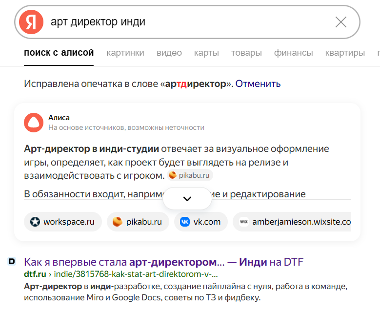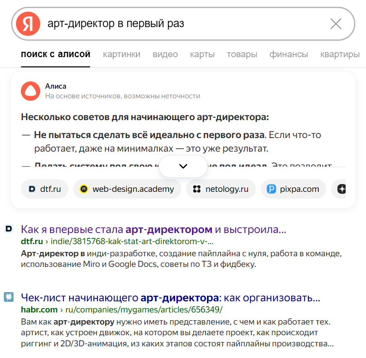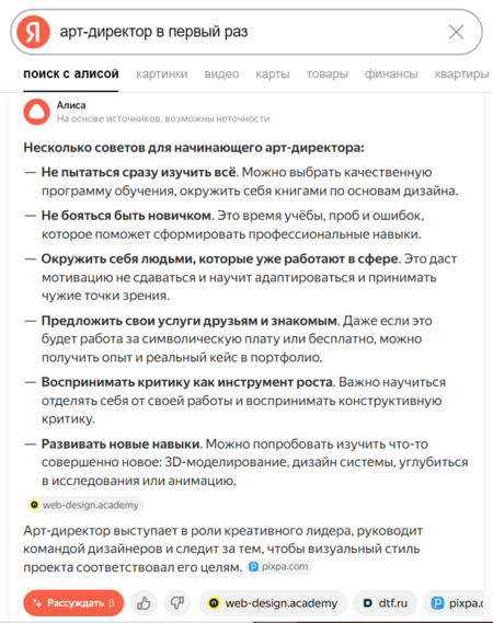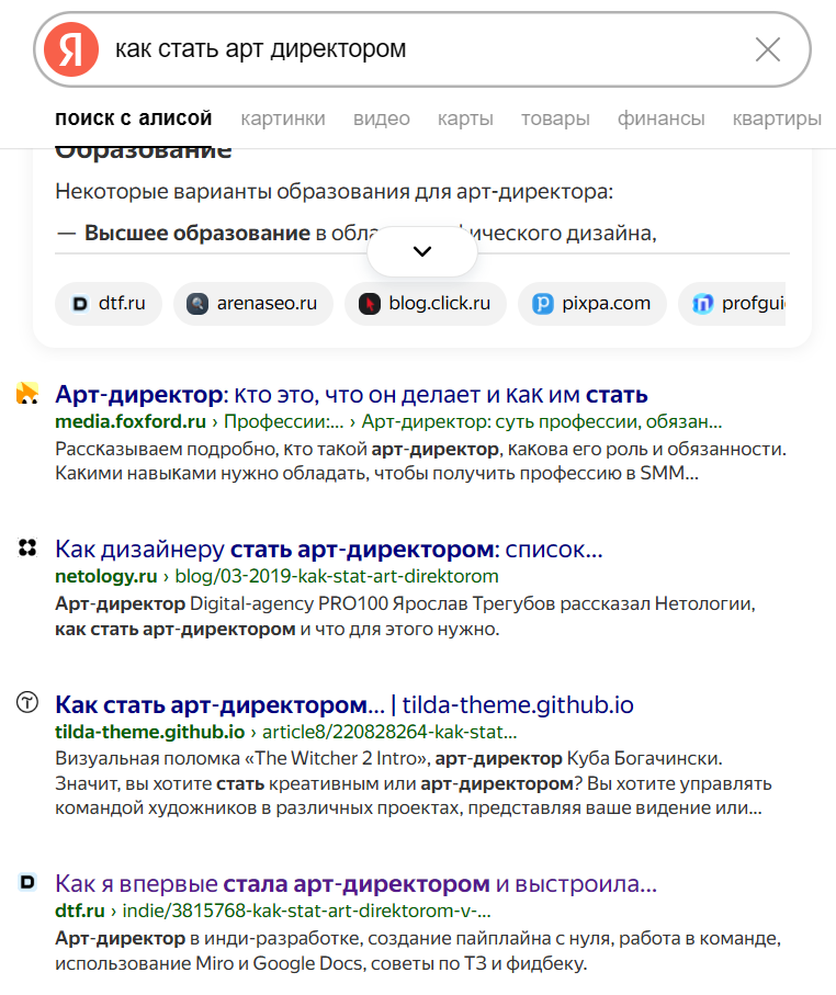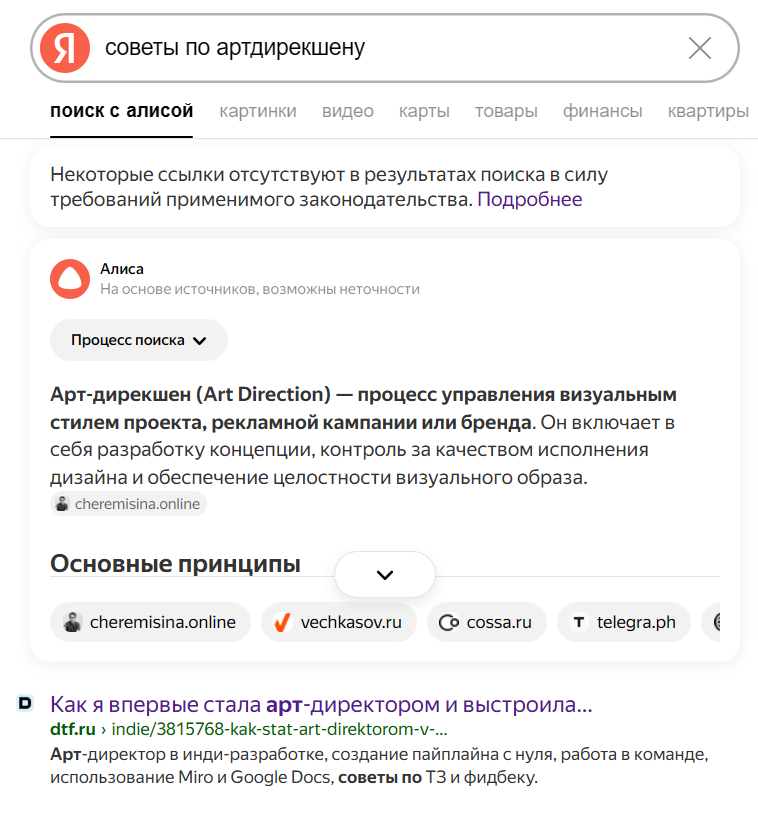 Во многих случаях поисковых запросов с содержанием слов «арт-директор» или «арт-дирекшен» именно моя статья находится в начале списка и становится источником нейросетевой выжимки от Алисы в Яндексе.