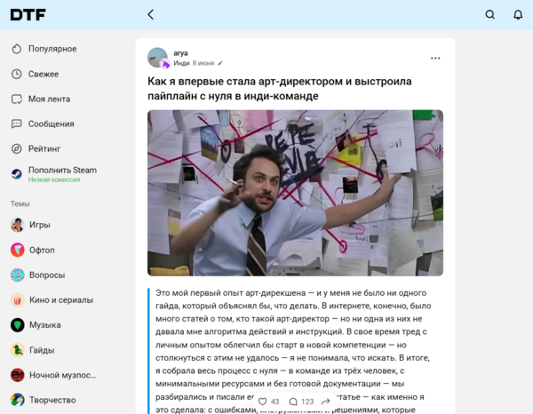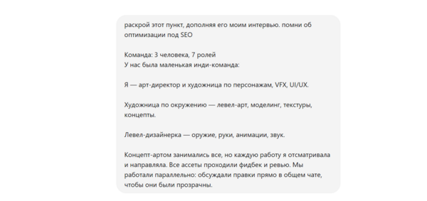 При выполнении заданий я создала SEO-оптимизированную статью под DTF — наиболее подходящую русскоязычную площадку, поскольку ее основной тематикой являются видеоигры как с позиции игроков, так и с позиции разработчиков. Статья наиболее репрезентативно подходила для отражения моего опыта на проекте в качестве арт-лида и позволила мне поделиться большим количеством инсайтов в повествовательном формате.