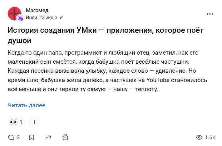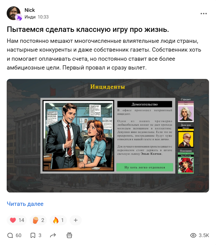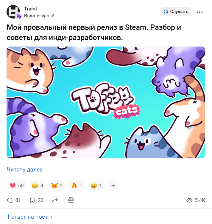 Охваты были настолько высокими, что статья долгое время была закреплена в теме «Инди», как «Популярное». Приблизительно, она держалась в топе около 16 часов, и собрала за это время охват выше средних значений по теме.
