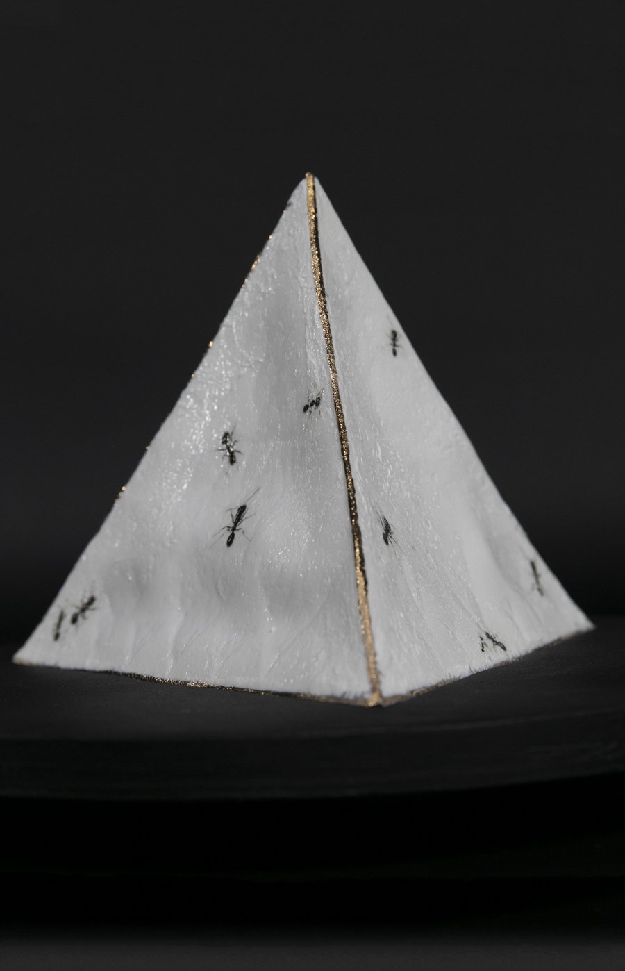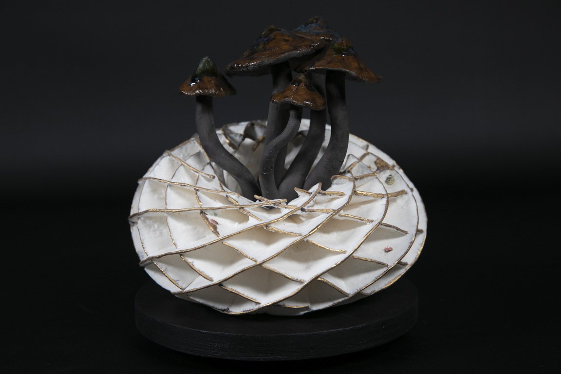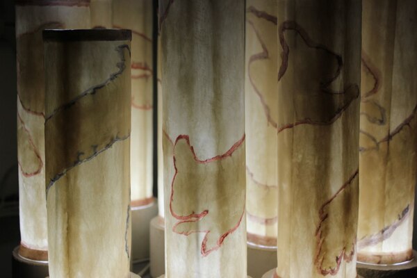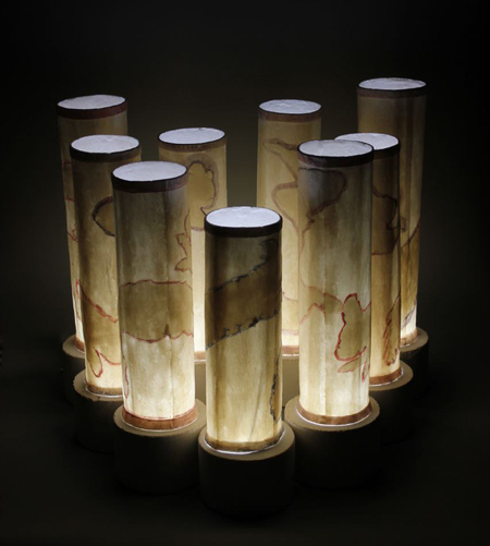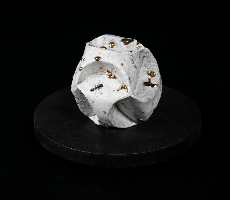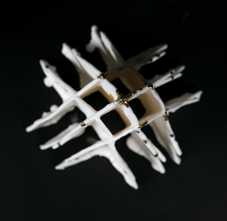 19 идентичных цилиндров сложились в обжиге в слоистую структуру. Сверху ортогональной сеткой нанесено жидкое золото. Работа фиксирует действие силы тяжести в обжиге-эксперименте