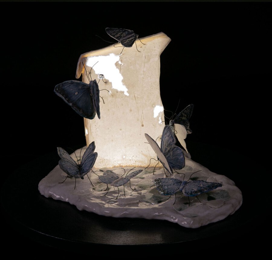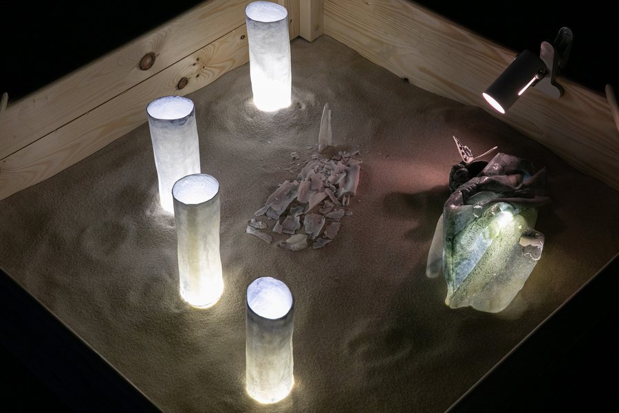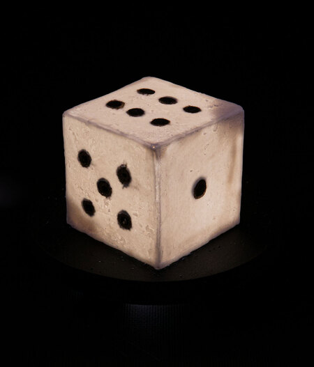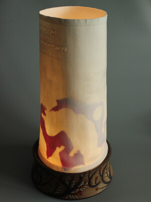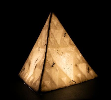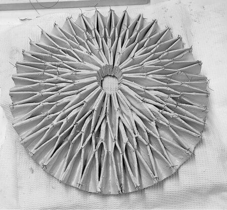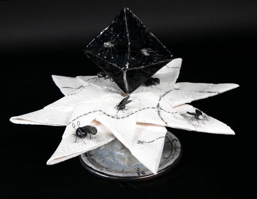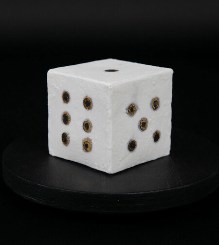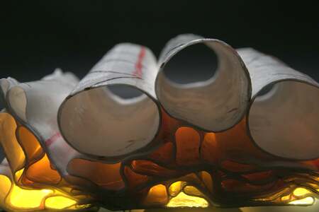 19 идентичных цилиндров сложились в обжиге в слоистую структуру. Сверху ортогональной сеткой нанесено жидкое золото. Работа фиксирует действие силы тяжести в обжиге-эксперименте