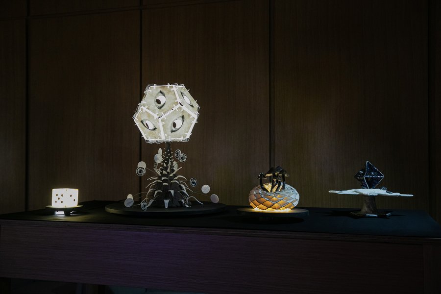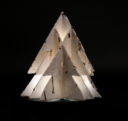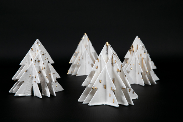 Новогодние подсвечники, вдохновленные техникой бумажной архитектоники «sliceform» и конструктивизмом. Имеют выемки для греющей свечи в центре. Фарфор, золото