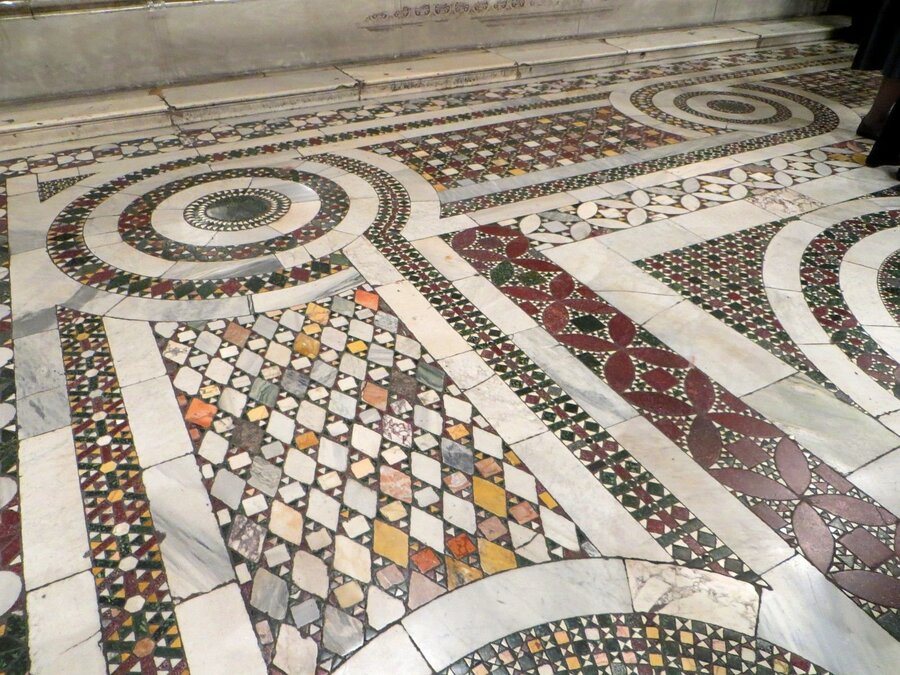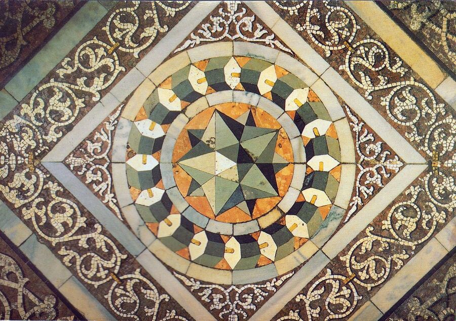 Но в общественных и религиозных зданиях развилась практика декоративной мозаики — прямой преемницы античных традиций. Напольные мозаики Возрождения отличались от средневековых большей симметрией и строгим построением композиции.