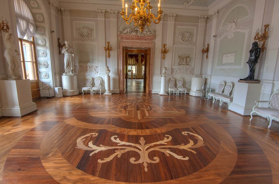 В период барокко в интерьер вошла по-настоящему театральная пышность: гранит и роскошный мрамор использовались для создания сложных, утончённых композиций, превращая полы в ключевой элемент пространств, насыщенных контрастами и плавными фактурами.