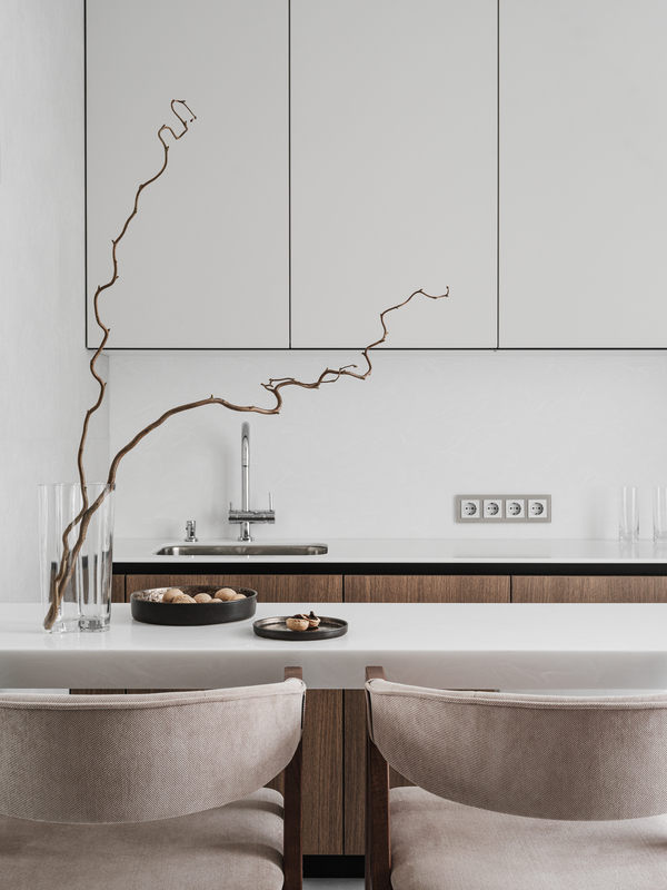 Это проект маленькой квартиры около 50 кв. м., которую заказчики приобрели под инвестиции — под аренду. Поэтому основная концепция проекта строилась вокруг практичности и функциональности. В квартире совсем небольшая кухня-гостиная, зато довольно большая спальня. Изначально коридор был большой, поэтому его мы поделили на прихожую и гардеробную, сделав вход в неё из спальни. В спальне встала большая кровать, макияжный столик. В санузле по просьбе заказчиков мы сделали просторную душевую, разместили стиральную зону и добавили много закрытых полок за зеркальными фасадами. В гостиной встал маленький, но комфортный диванчик, полубарная стойка и небольшая кухня со всем необходимым функционалом для квартиры под аренду. На балконе обустроили лаундж зону и шкаф для долгосрочного хранения. Штукатурку стен от застройщика покрасили в основной цвет стен как и во всей квартире, а на пол положили ту же широкоформатную плитку. В целом интерьер получился очень теплым и обволакивающим за счет единого цвета, примененного на всех плоскостях — на полу, на стенах, гипсокартонный потолок мы тоже покрасили в цвет стен. Здесь у нас также несколько оттенков текстуры дерева, которые дружат между собой — это шпонированные МДФ панели в качестве изголовья кровати, большой комод, также выполненный в шпоне дуба, инженерная доска на полу в спальне, детали шкафа в прихожей, а на кухне фасады из cleaf панелей с красивой и очень натуральной текстурой под дерево (шпон не использовали из соображений практичности по просьбе заказчиков). Потолок в квартире больше 3 метров, не хотелось делать кухню до потолка — так она выглядела бы громоздкой в таком небольшом помещении. Мы сделали короб, довели до него кухню, а чтобы создать нужный эффект, отделали короб зеркалом. Так смотришь и как будто потолок продолжается за кухню туда дальше. А шкаф в прихожей, наоборот, мы оторвали от пола, «подвесили». Освободили тем самым площадь пола, за счет этого помещение выглядит больше. А за счет огромного зеркального полотна — площадь пола удваивается.