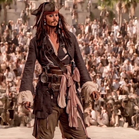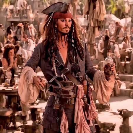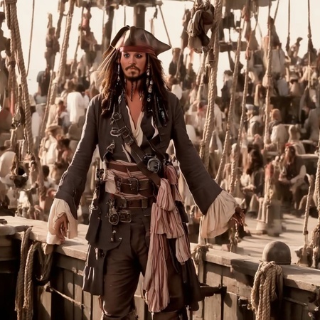 промты: 'Captain Jack Sparrow with a bottle of rum', 'Captain Jack Sparrow with a team of pirates on the beach 3. Captain Jack Sparrow fights with skeletons', 'Captain Jack Sparrow fights with a huge kraken', 'Captain Jack Sparrow with a black death mark on his arm', 'Captain Jack Sparrow looks straight ahead', 'Captain Jack Sparrow on a ship with black sails', 'Many jack captains are standing like a sparrow and looking at each other', 'Captain Jack Sparrow', 'Captain Jack Sparrow and his family of pirates', 'pirate bottle', 'pirate hat triangular', 'Jack Sparrow's compass', 'The black Pearl ship'