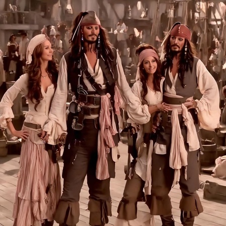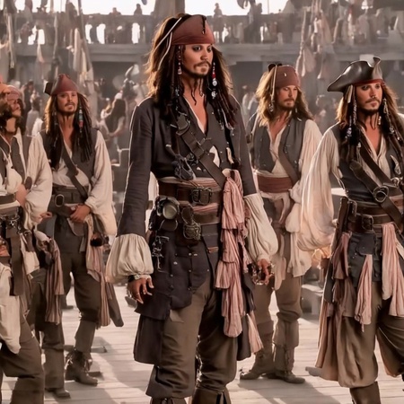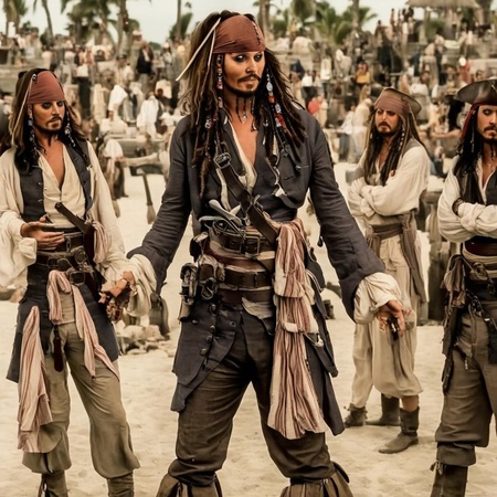 Мне нравятся также картинки, где стоит несколько Джеков (промт был вдохновлен сценами из фильма, когда Джек видел много своих братов близнецов и размышлял вместе с ними), но каждый следующий капитан терял узнаваемость самого актера, а также какие-то детали одежды