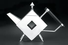 Данный чайник очень известен в творчестве Кристофера Дрессера. Выполнена работа полностью из нержавеющей стали, кроме ручки, она выполнена из пластика, который нагревается не так сильно как металл. Сам чайник имеет форму ромба с отверстием по середине, Данный чайник — одно из самых известных произведений в творчестве Кристофера Дрессера. Он выполнен полностью из нержавеющей стали, кроме ручки выполненная из пластика, который нагревается не так сильно как металл. Сам чайник имеет форму ромба с отверстием по середине, и для того чтобы предмет был устойчивым, дизайнер предусмотрел четыре тонкие ножки. На мой взгляд, несмотря на изящные, геометрические формы бытового предмета, функциональное составляющая несколько уступает визуальной. Во первых, не полноценная форма ромба из-за отверстия в середине форме чайника сильно усложняет его мытьё и доступ к дну. Во вторых, откидная крышка должна мешать расположению заварки из-за своей подвижности, что будет увеличивать риск обжечься, поскольку использования чайника предполагает наличие в нём кипятка.