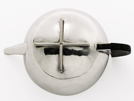 Следующий чайник Кристофера Дрессера довольно сильно по конструкции похож на предыдущий, но вместо ромба была использована форма более плавная форма похожая на бублик с отверстием по середине. На мой взгляд, недостатки сохраняются, но функциональность становится выше поскольку форма создаёт меньше препятствий, чем угловатая и ромбовитая. Также стоит отметить, что оба чайника будто вписаны в некую плоскость, что придаёт им изящность и монолитность форму, что также делает их более компактными.