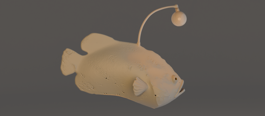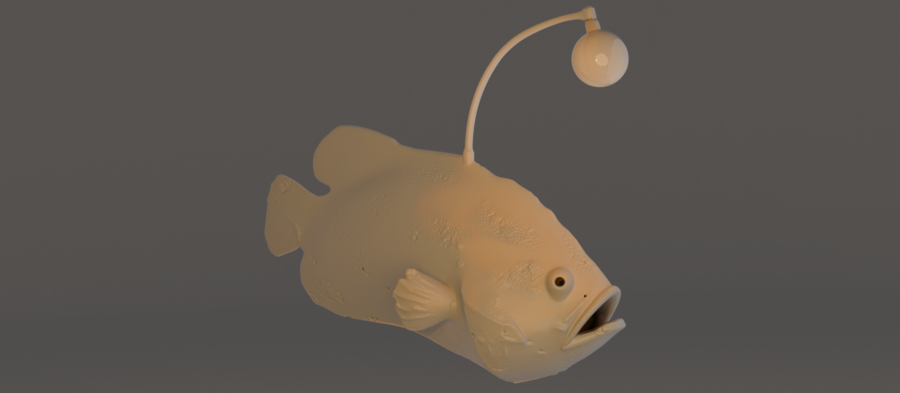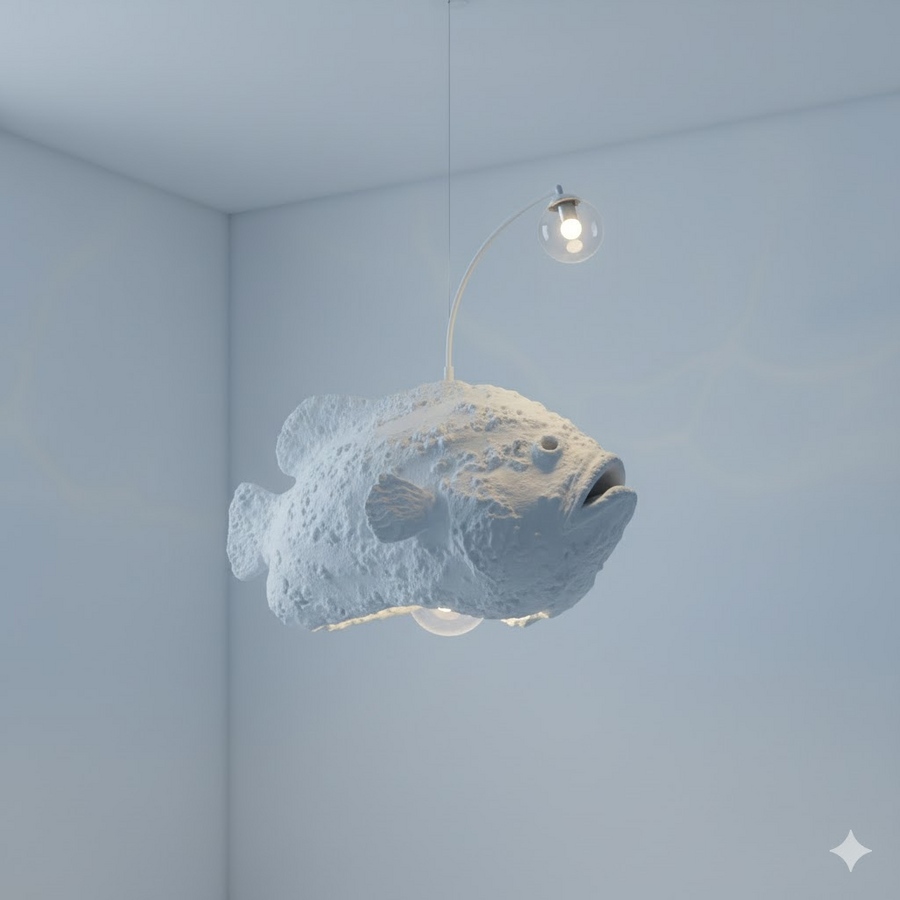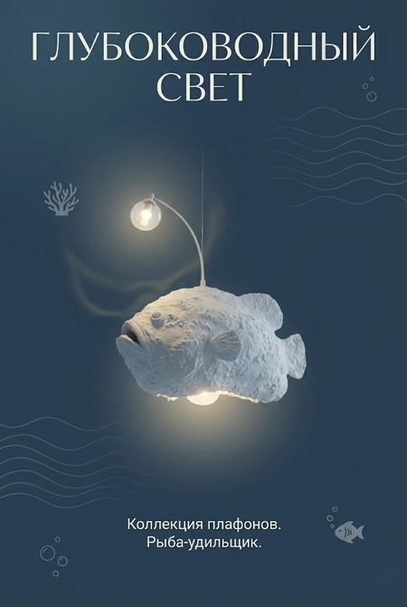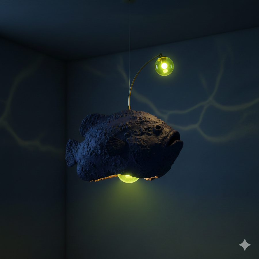 Смелый светильник в виде глубоководной рыбы-удильщика. Светящийся шарик-«удочка» выполняет роль основного источника света, символизируя единственный источник света и надежды в абсолютной темноте океанских глубин.